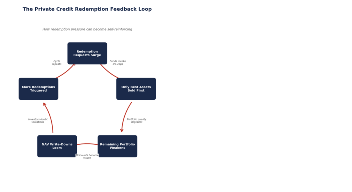 That is the loop. Redemptions lead to asset sales. Asset sales degrade portfolio quality. Degraded quality and visible discounts could trigger more redemptions. And the cycle may continue.