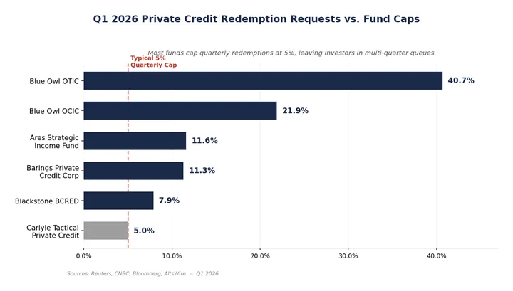 Figure 1: Q1 2026 redemption requests across major private credit funds, compared to the standard 5% quarterly cap.