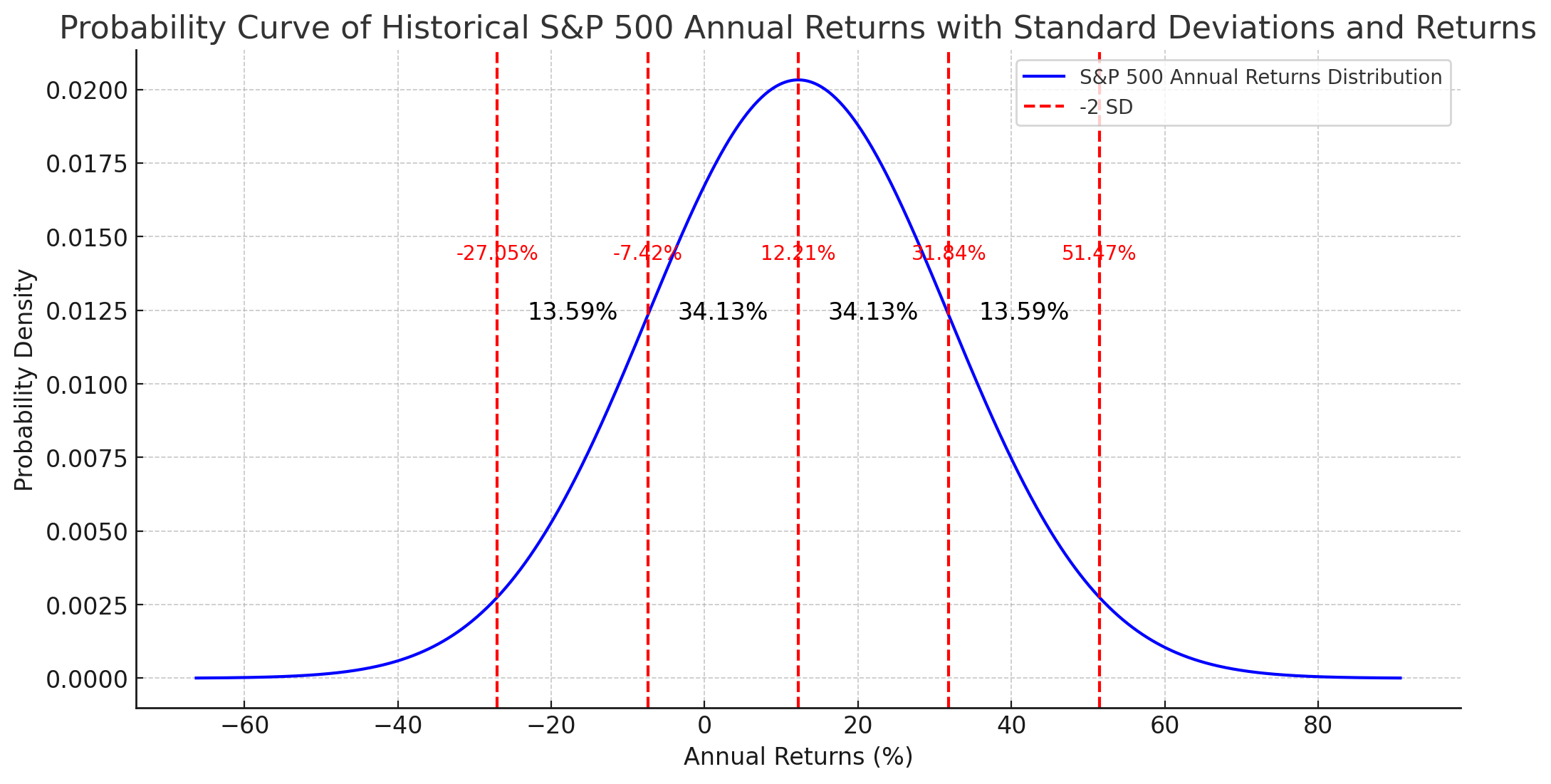 Since 1926, 68.26% of annual returns for the S&P 500 have landed between -7.42% and 31.84%. Meanwhile, 95% of returns have landed between -27.05% and 51.47%. This means that 2.5% of the time, returns have been below -27.05%.